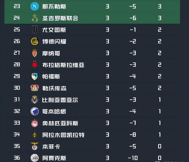 热刺是唯一取得1胜2平积5分的球队,独自排在第15,埃因霍温和亚特兰大则是1胜1平1负积4分位列第16和第17。马赛、马竞、布鲁日、毕尔巴鄂竞技、法兰克福、那不勒斯以及圣吉罗斯联合都是1胜2负积3分,依次排在第18至第24位,尤文图斯、博德闪耀、摩纳哥、布拉格斯拉维亚、帕福斯和勒沃库森则均为2平1负积2分,位列第25至第30。只取得了1平2负的比利亚雷亚尔、哥本哈根、奥林匹亚科斯和阿拉木图凯拉特以1分排在第31至第34,三战皆墨一分未得的本菲卡和阿贾克斯则只能垫底。